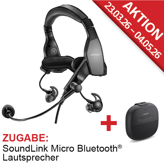 - 3× Bose Aviation Headsets (gemischt) → 1 x gratis Bose Soundlink Micro Bluetooth Lautsprecher + 10 % Rabatt auf das 2. & 3. Bose Aviation Headset