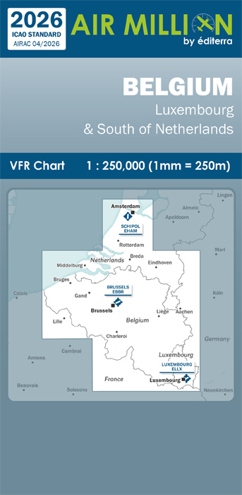 Air Million Zoom in scale 1 : 500.000 and 1 : 250.000 (Belgium). Maps with topography and information for VFR pilots. Airspace structure, radio navigation aids and the most important airfield data such as identification, frequency, runway category.
