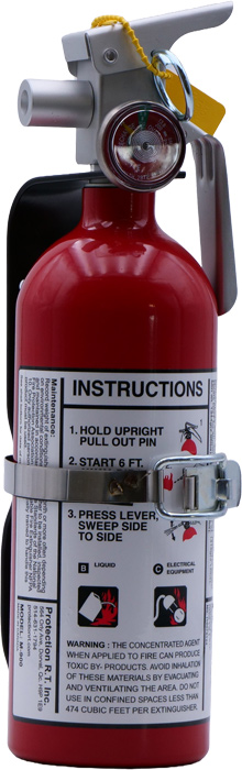Compact aluminum fire extinguisher with FAA approval, approx. 29 ,9cm in height, total weight including bracket 1.41 kg. Extinguishing agent: 0.9 kg Halotron. Service life: 12 years from date of manufacture. Minimum confined space requirement: 474 cu ft (13,4 m³)