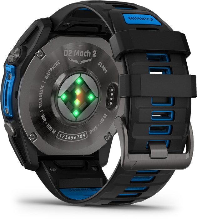 D2 Mach 2 watch 51 mm with titanium band, additional silicone band, USB-C charging and data cable, quick start guide. A German user manual for download can be found under the “Downloads” tab.