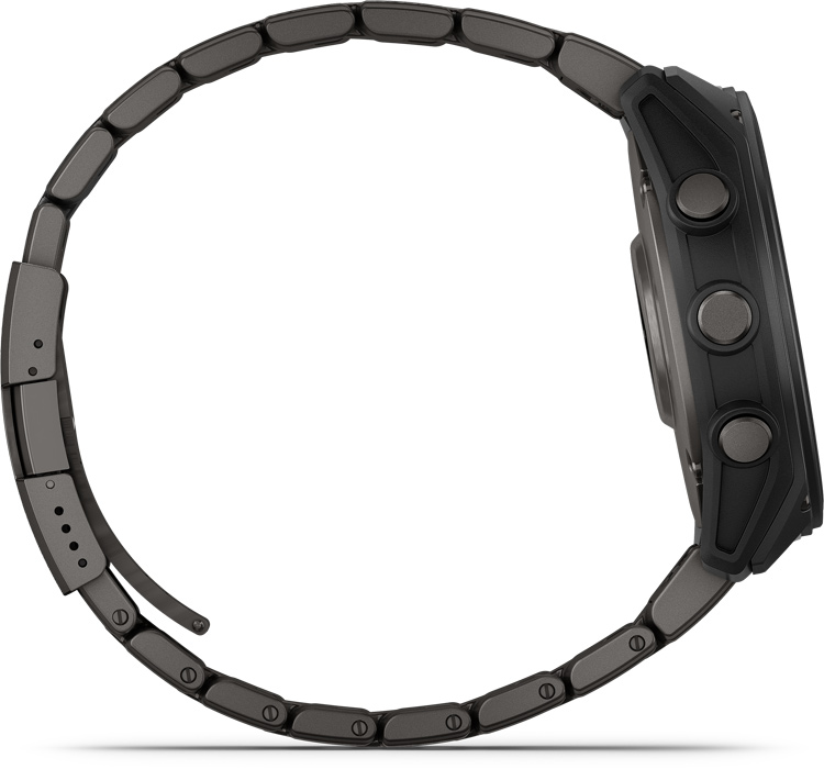 - Titanium bezel, fiber-reinforced polymer case with metal rear cover, sapphire glass, titanium band