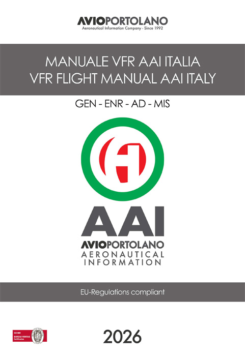 Description: The AAI Italy VFR Manual is made by assembling, integrating, and publishing – in the form of the necessary texts and charts – official information from the state (AIP- Aeronautical Information Publication), together with information from private sources (AAI - Avioportolano Aeronautical Information) and with other sources that can be used in order to achieve the purpose, including those from sector professionals and pilots