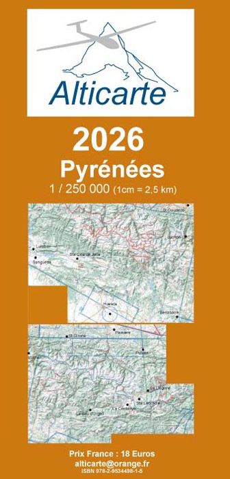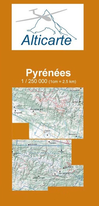 Die Segelflugkarte mit dem Relief der Pyrenäen Sperrgebiete, Lufträume sowie Flugplätze mit Höhe und Frequenz sind enthalten.