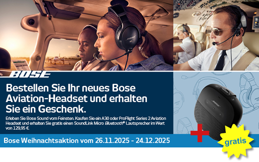 - 3× Bose Aviation Headsets (gemischt) → 1 x gratis Bose Soundlink Micro Bluetooth Lautsprecher + 10 % Rabatt auf das 2. & 3. Bose Aviation Headset